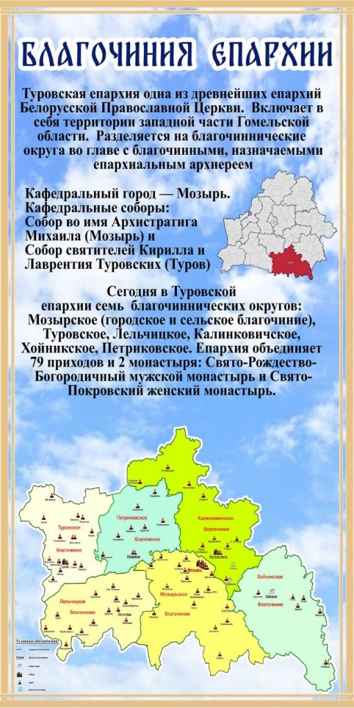 В 1990 году была образована Гомельско-Мозырская епархия. В ее ведении находились все храмы на территории Гомельской области. Управлял ею епископ Аристарх (Станкевич). В 1992 году по распоряжению Синода Белорусской Православной Церкви была возрождена древняя Туровская епархия, и 24 июля того же года архимандрит Петр (Карпусюк) был хиротонисан в епископа Туровского и Мозырского. Епархия была выделена из Гомельской и состояла из 23 храмов и одной монашеской женской общины при храме в честь Покрова Божией Матери в городе Хойниках. Было создано шесть благочиннических округов: Мозырский, Петриковский, Житковичский, Лельчицкий, Наровлянский и Хойникский. Территория епархии распространяется на 10 районов Гомельской области: Мозырского, Калинковичского, Петриковского, Житковичского, Ельского, Наровлянского, Хойникского, Лельчицкого, Брагинского и Октябрьского. Границы новой епархии совпадают с границами довоенной бывшей Полесской области, центром которой был г. Мозырь. Определением Священного Синода от 24 декабря 2004 года ЖУРНАЛ № 91 епископом Туровским и Мозырским наречено быть архимандриту Стефану (Нещерет), клирику Гомельской епархии.